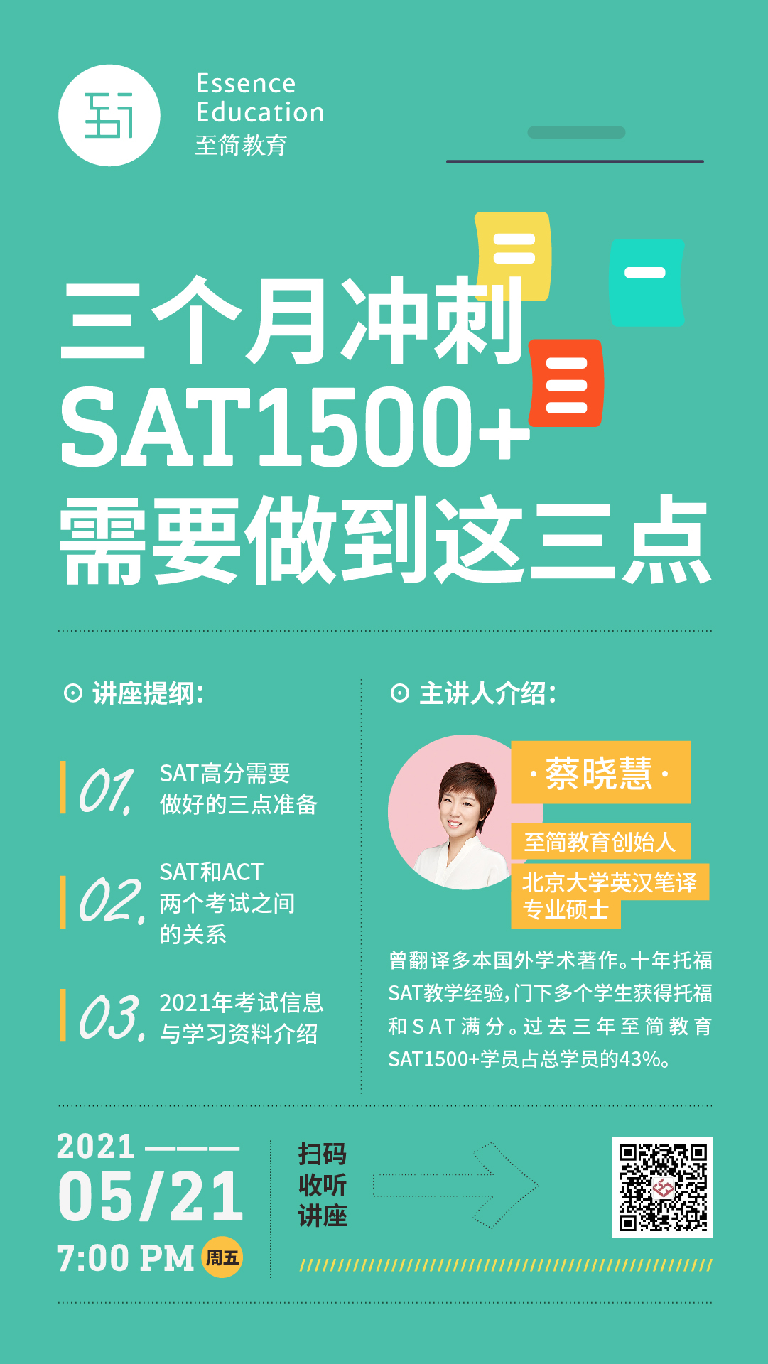 至简教育创始人,北京大学英汉笔译专业硕士。曾翻译多本国外学术著作。十年托福SAT教学经验,门下多个学生获得托福和SAT满分。过去三年至简教育SAT1500+学员占总学员的43%。
